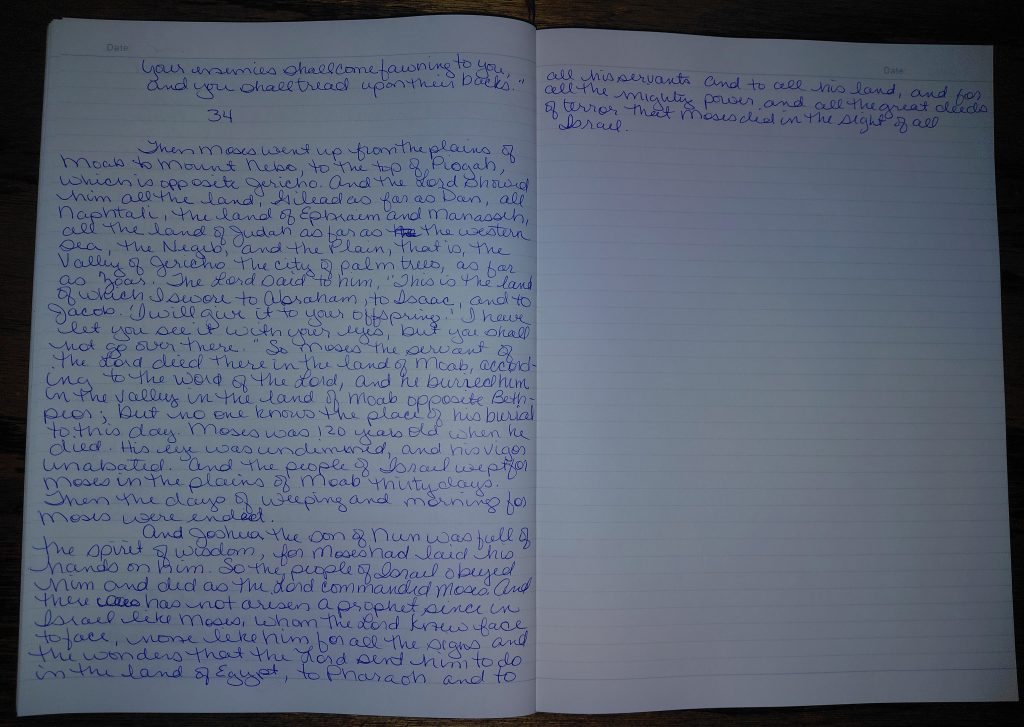 “So Moses the servant of the Lord died there in the land of Moab, according to the word of the Lord, and he buried him in the valley in the land of Moab opposite Beth-peor; but no one knows the place of his burial to this day. Moses was 120 years old when he died. His eye was undimmed, and his vigor unabated.”