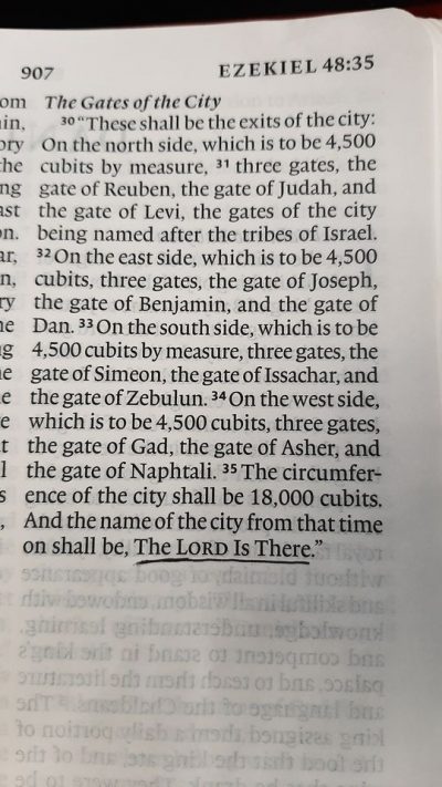 Good morning, finishing the book of Ezekiel today, chapters 45-48. More instructions for then to follow as they get back and reset up the land the Lord has given them. I like the last statement, “The name of the city from that time shall be, The Lord Is There.” It makes me yearn to be in His land in heaven someday.