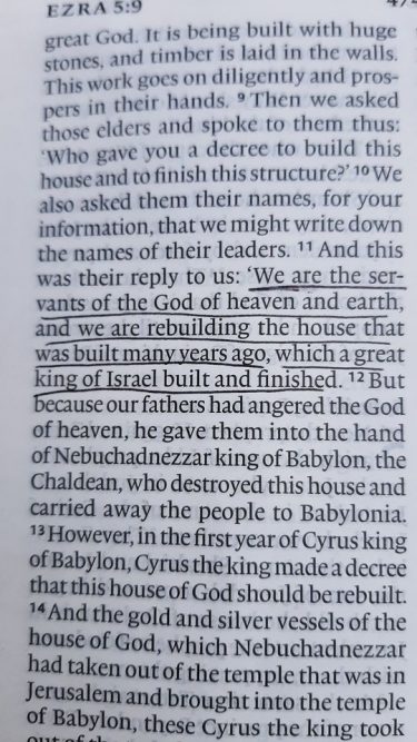 Good morning, I started reading Ezra today, chapters 1-5. It is nice to see the people return to their land. Even though the building of the city will take years it has begun. In chapter 5, they were confronted a second time about building they respond wonderfully, “We are the servants of the God of heaven and earth”. Such a strong statement.