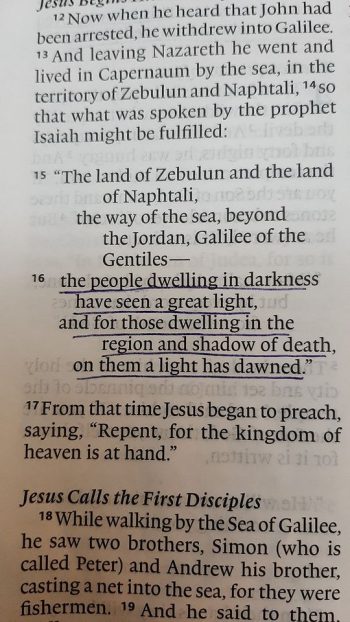 I will start with chapter 4 verse 16. This verse humbles me a bit because it made me think of when I was living in darkness, before I became a child of God. Then seeing a great light. Seeing the truth, seeing salvation. Such a beautiful thing.