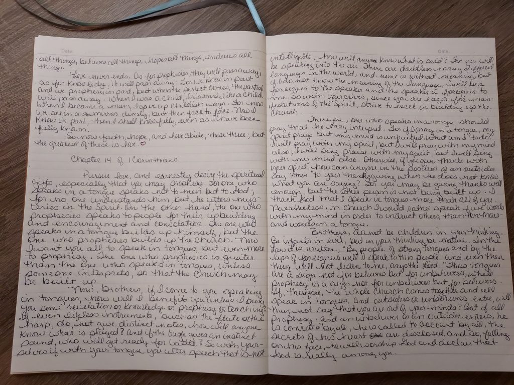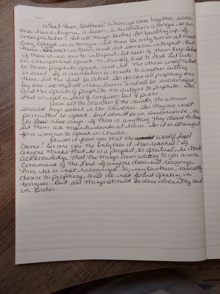 Good morning. A longer chapter today. A chapter that I need to study on more, prophecy and speaking in tongues. In verse 20 he makes a statement, “Brothers, do not be children in your thinking.” I feel like is just for me, because I have not studied enough on these subjects in the bible. But that is ok. I just need to remember not to try to teach on things I do not fully understand. How can I understand unless I see? I will continue to read and continue to try to understand. I will pray for understanding.