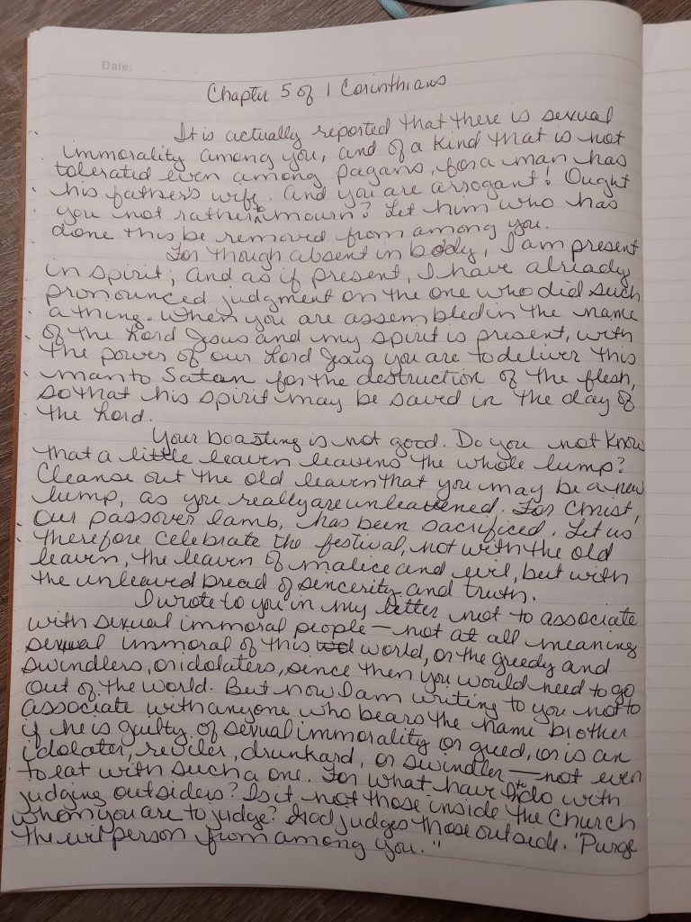 Good morning. Chapter 5 is a hard chapter for me. It is very clear what he was asking the brethren to do. They were to remove the person who was committing sin from among them. This is a very hard thing for me. Especially knowing that I am not perfect and sin daily.