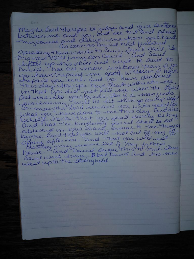 Can you imagine, running from your enemy, then finding that he walked into the cave with which you were already in? Many would have taken the enemy hostage or killed him. But not David. He felt terrible for cutting a corner off Saul’s robe. Why? Because Saul’s was anointed by God and David was devoted to God.