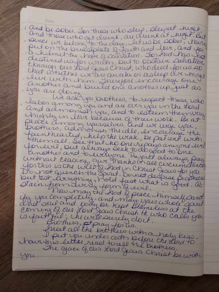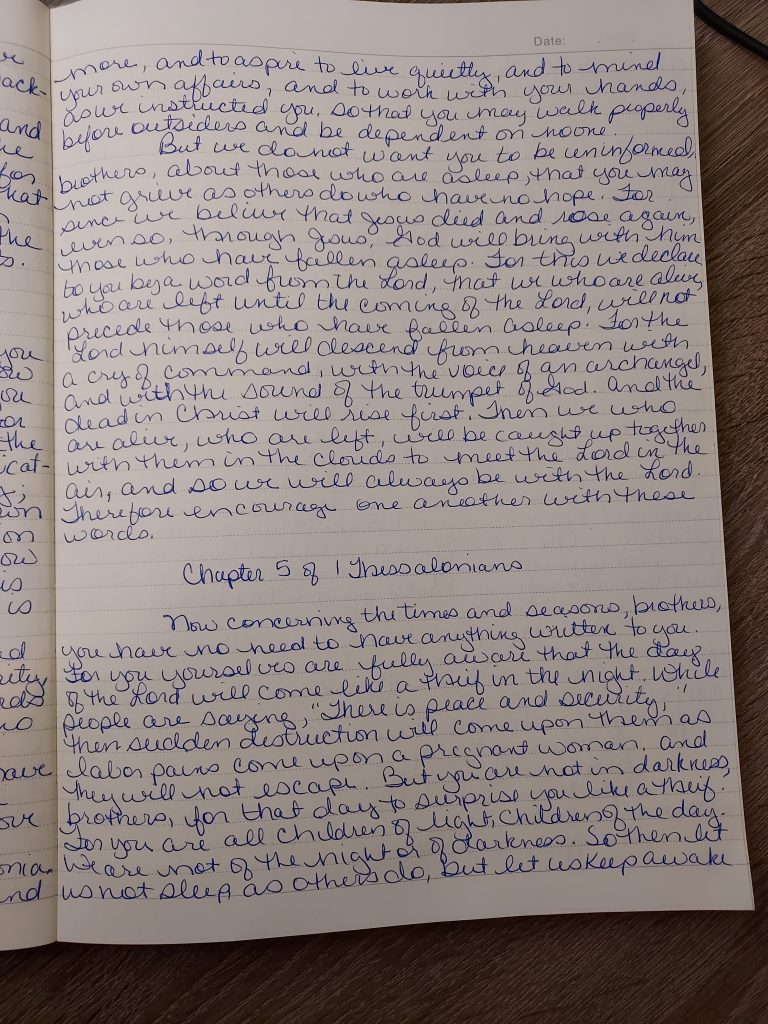 Good morning, the last chapter of 1Thessalonians. As I wrote this chapter I could see the faith Paul had in these people and the faith he hoped they would continue to have. As he encouraged them, they encouraged him. I always like to see what Paul will say at the end of his letters so that he can motivate them to stay on tract and this letter was no different: