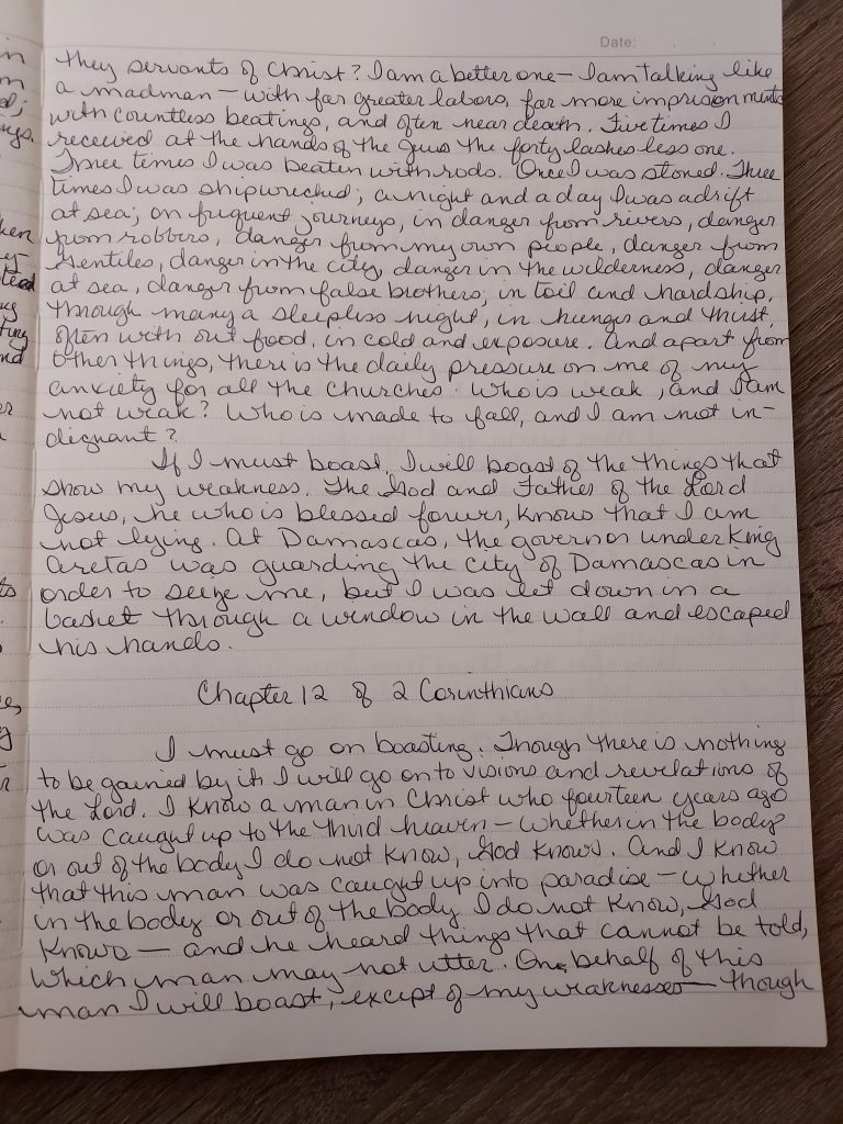 I think we all have weaknesses, just as Paul did. These verses give me a better outlook on my weaknesses. When my body is weak I need to remember to focus on my spiritual life. Then I can be strong. There are days that I cannot do anything about this physical broken body but I can always be thankful for it. My body gives me a different outlook to things. It reminds me of this physical world, it reminds me that there is a better eternal life with the Lord. I can keep working to make my soul better. Though my body is weak, my soul can be strong.