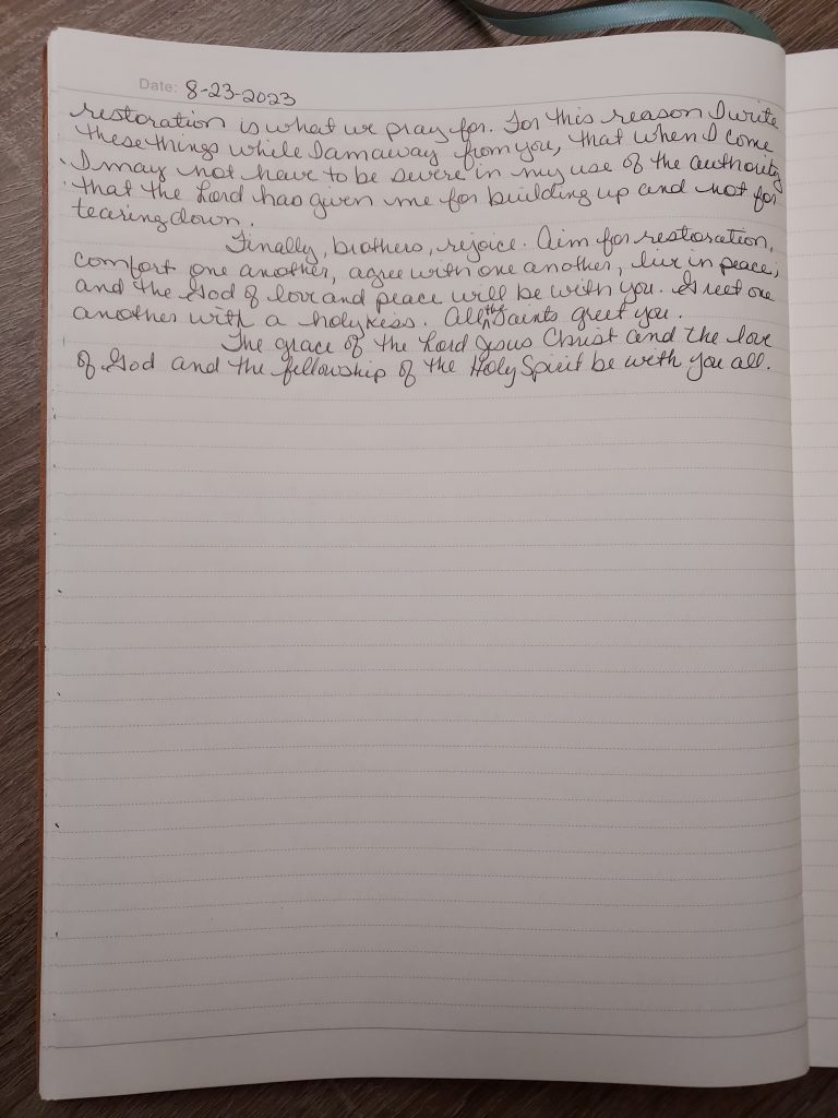 “Finally, brothers, rejoice. Aim for restoration, comfort one another, agree with one another, live in peace; and the God of love and peace will be with you.”