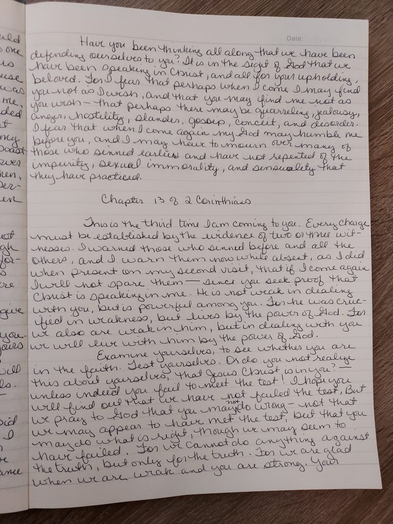 I am so thankful that I was able to finish another book. It definetely slowed me down by writing each chapter at a time. I noticed more love in Paul than I ever had before. It was always there, I just never took the time to see his love for the Corinthians. He truly cared for these people and lived by the advice he gave to them. I could see his comfort and peace that he wanted for them all.