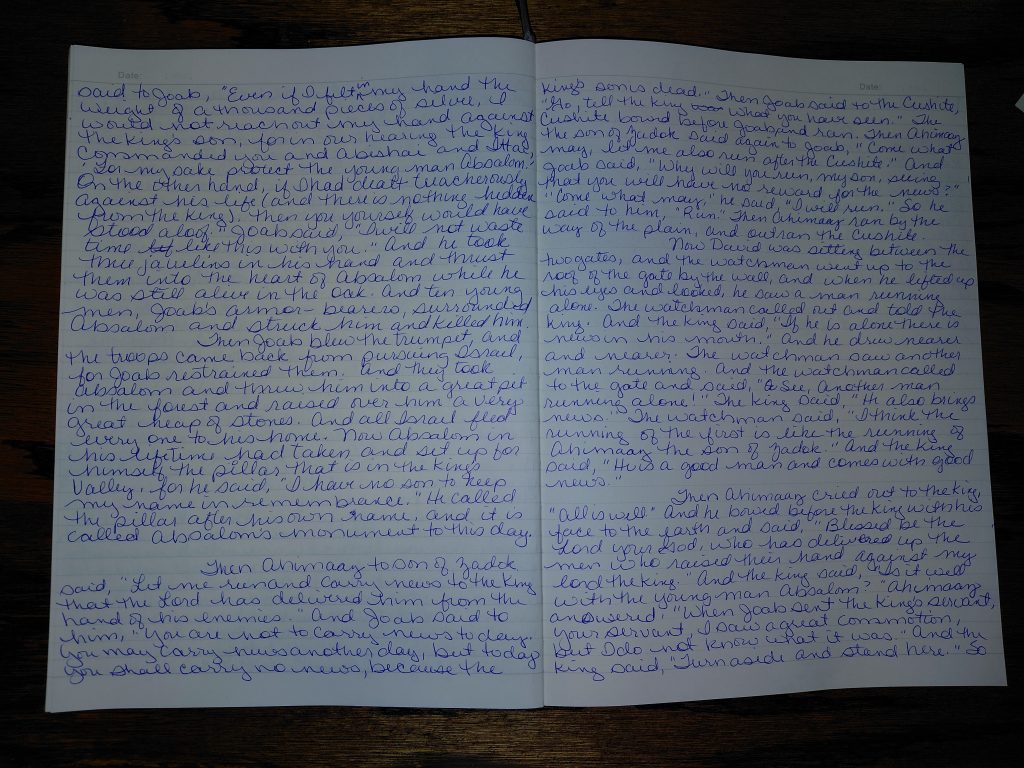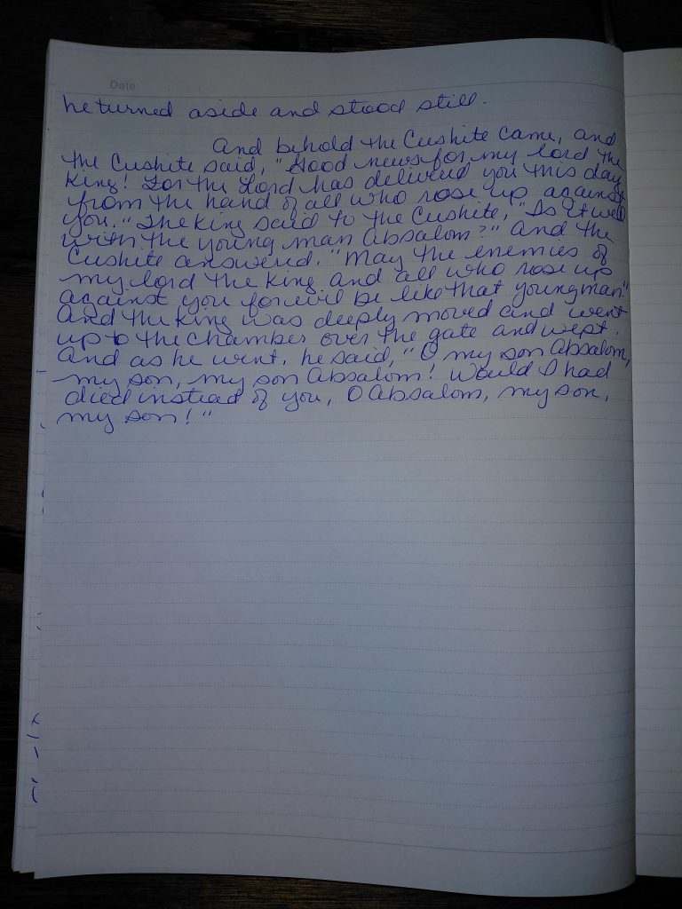“And the king was deeply moved and went up to the chamber over the gate and wept. And as he went, he said, “O my son Absalom, my son, my son Absalom! Would I had died instead of you, O Absalom, my son, my son!”