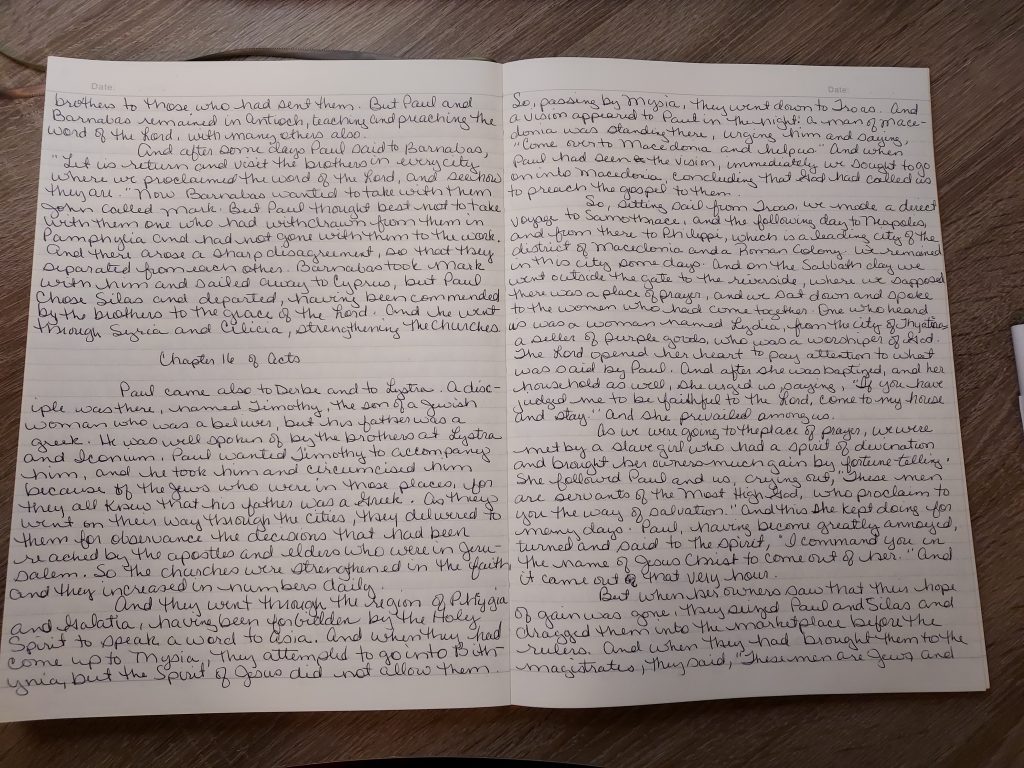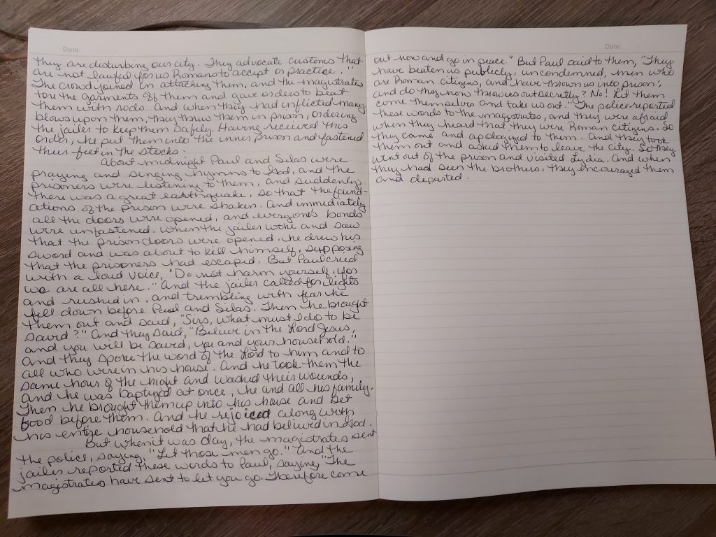 Good morning, I am working with blurry eyes and a blurry mind today but I got my writing done. Sometimes we need to stay focused even though things aren’t perfect. My blurry eyes are nothing compared to what Paul and Silas went through in this chapter, Yet they were singing and praying to God as they were in prison. What a blessing to know that no matter what God is there for us. Because of their faithfulness while they were in prison, a jailer/guard chose to follow the Lord. Even out of what looked like a bad situation, came something good.