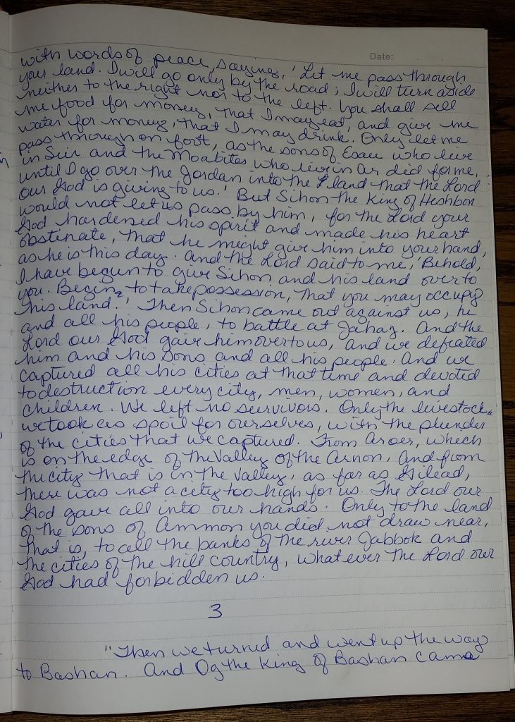 As I read this verse I could not help but think about Moses and all that he had seen, and how much more he wanted to see, but he wouldn’t see it on this earth. I think sometimes it is easy to cling to what we see in front of us, so much so, that we don’t see the big picture. Moses would soon be a spiritual world allowing Joshua to care for the people. I do understand that Moses wanted to see the rest of the story play out. But that wasn’t for him to decide.