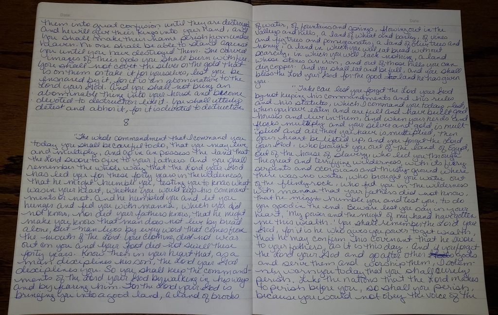 “Take care lest you forget the Lord your God by not keeping his commandments and his rules and his statutes, which I command you today, lest, when you have eaten and are full and have built good houses and live in them, and when your herds and flocks multiply and your silver and gold is multiplied and all that you have is multiplied, then your heart be lifted up, and you forget the Lord your God, who brought you out of the land of Egypt, out of the house of slavery, who led you through the great and terrifying wilderness, with its fiery serpents and scorpions and thirsty ground where there was no water, who brought you water out of the flinty rock, who fed you in the wilderness with manna that your fathers did not know, that he might humble you and test you, to do you good in the end. Beware lest you say in your heart, ‘My power and the might of my hand have gotten me this wealth.’ You shall remember the Lord your God, for it is he who gives you power to get wealth, that he may confirm his covenant that he swore your father, as it is this day.”