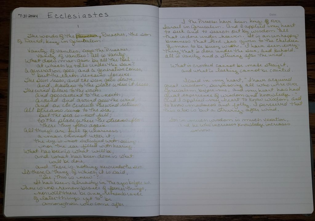 Solomon begins this book a bit on the dreary side. It definitely can put into perspective the things that really matter. All of the things I spend most of my time on is material. My home, my hobbies, studying on my latest interest. The world will continue without me no matter what I do today. The sun will rise and go down, the winds will blow, the streams and the sea will all be unaffected. Do I really make a difference anywhere?