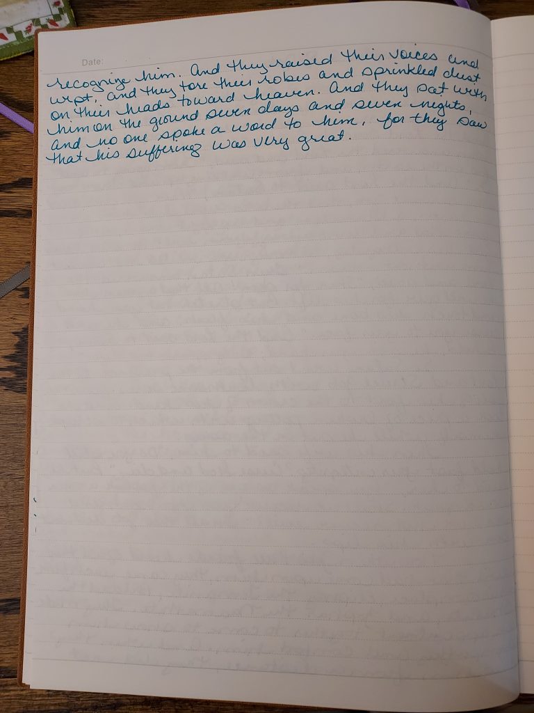 Wow… these men really were his friends. Could you imagine leaving your home and going to a friends house for 7 days, sitting with them , supporting them? Just being next to them. This is a quality I don’t have. I guess that is why these verses jump out at me. They went to support and comfort Job the best way they knew to do. We will see in the next chapters that some comfort is best left without words. Presence is often better than any words that can be said. These men spent 7 days and nights, just in presence. Sadly, I think a prayer or a note is good enough in a time of sorrow. I have often felt that we have lost something in the way of mourning for ourselves and others. I feel I am afraid to show emotions outwardly. The way those in the bible showed mourning seems over dramatic because I am so reserved. I wish I could feel more like David, like Job, like Paul, mostly like Jesus. As I pray for a more tender heart, I have to be able to accept a more tender heart. That is a hard thing for one who is so reserved.