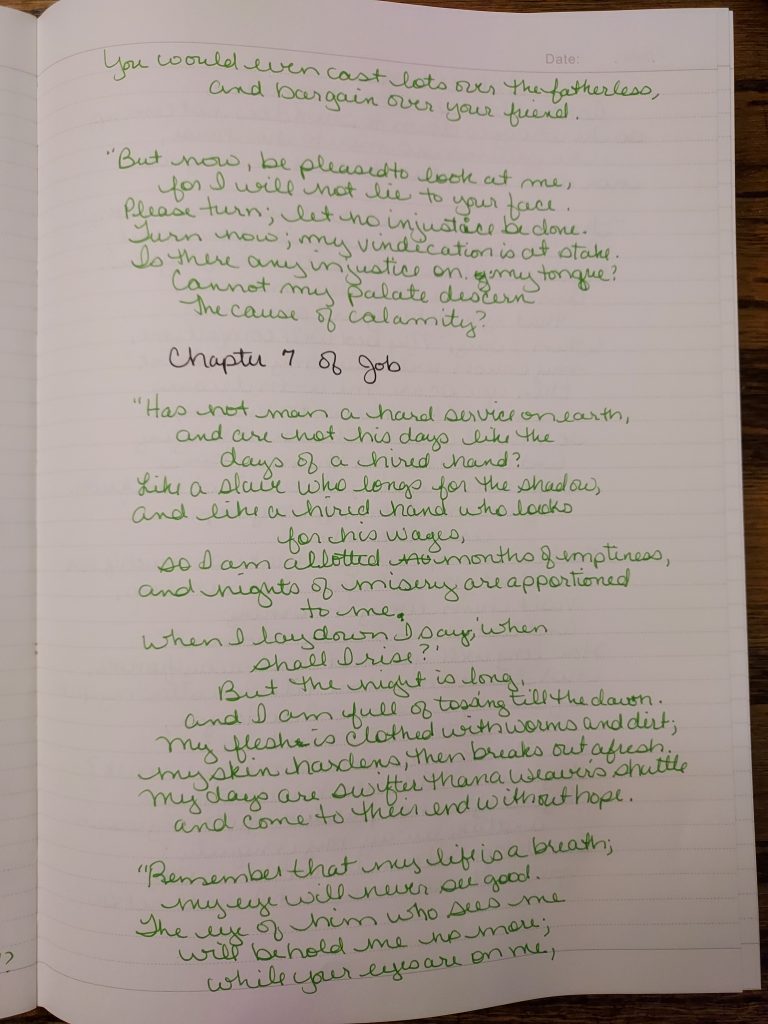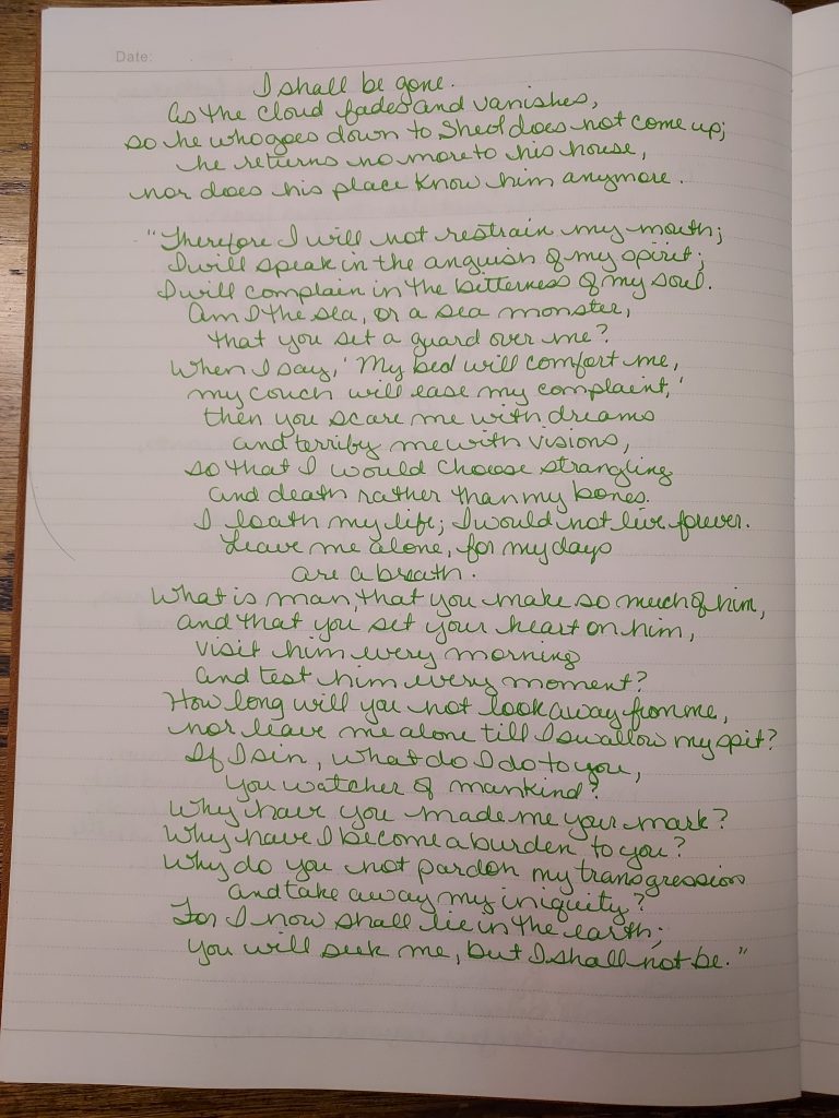 His entire life was transformed in such a short time. It would only be natural to loose hope in this world. His friends didn’t help any with the situation. No wonder he says, ‘Leave me alone, for my days are a breath’ in verse 16. Even though they chose to be with him in physical sense, their judgements prohibited them to be with him spiritually. Job had to continue to work out his grief on his own. Stay tuned to see how it works out…..
