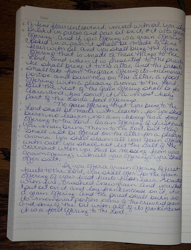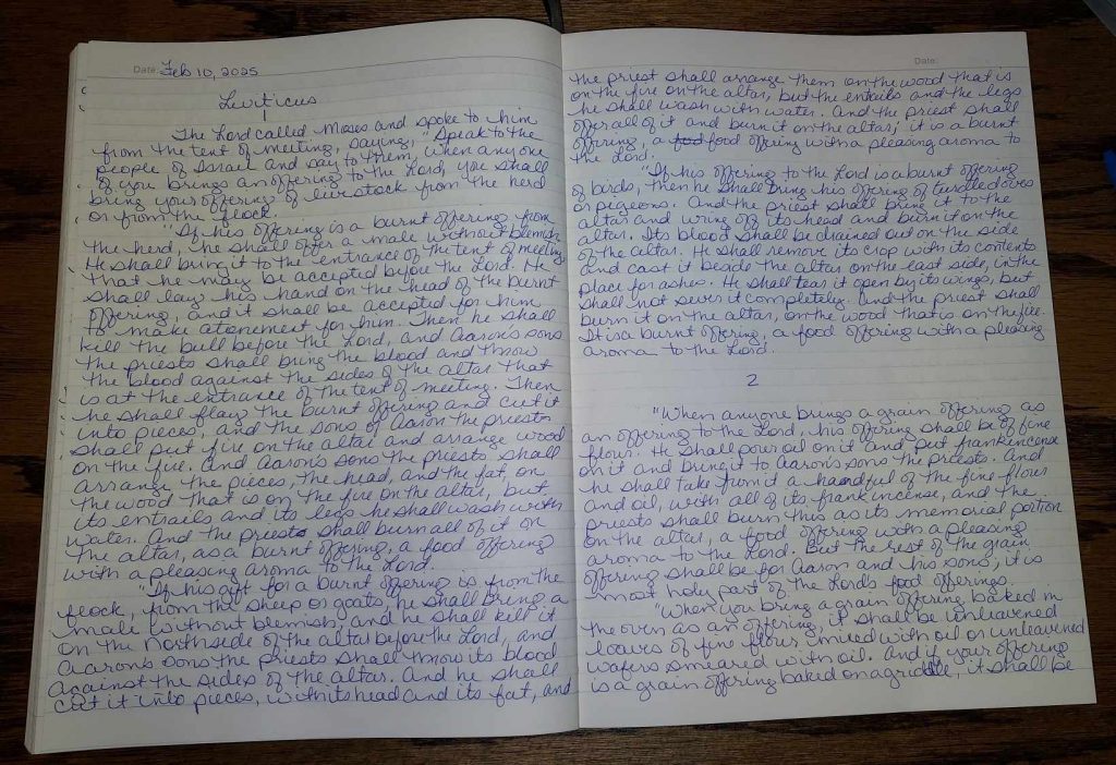 The beginning of a new book, Leviticus. I am so thankful that I have been able to write this much of the Bible. I am hoping to keep going and finish my writing in 2027. It still seems so far away, but I have a feeling it will be here before we know it. I started this journey in January of 2023, a little over 2 years. I have been blessed. I am noticing things I didn’t notice before. I am understanding more. I am making connections between Old and New Testaments. I am blessed. I hope that I can continue and finish it all. We will see. Sometimes there is a struggle. Just like the Israelites I need to be reminded to stay focused.