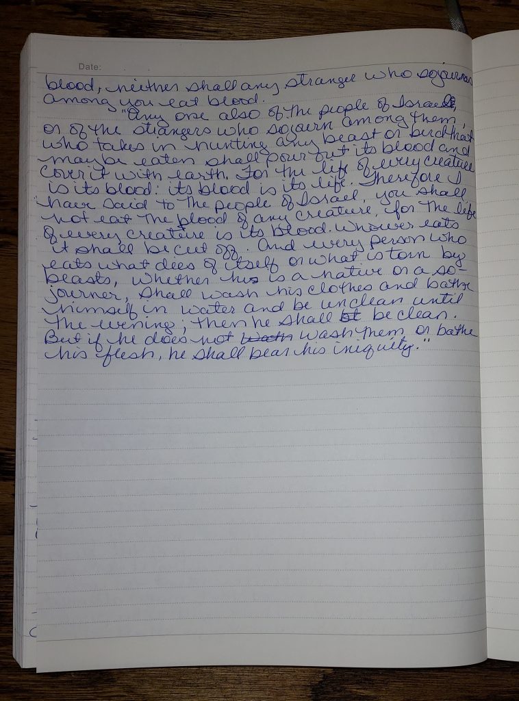 “For the life of every creature is its blood; its blood is its life. Therefore I have said to the people of Israel, You shall not eat the blood of any creature, for the life of every creature is its blood. Whoever eats it shall be cut off.”