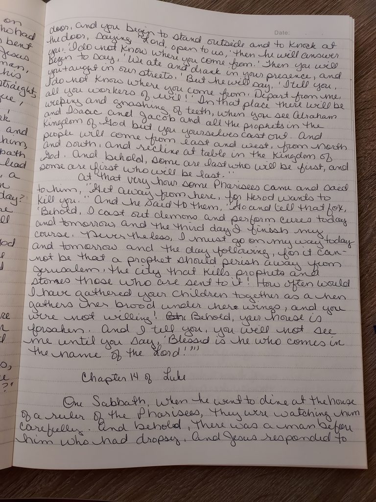 Good morning. As I was going over my writing today, struggling with what to reflect on with everyone, I went back to the parable of the great banquet. Those that the master invited made excuses and did not come. So the master filled his banquet with those who would, the poor, the crippled, the blind and lame, and more. The last verse of that parable, verse 24: