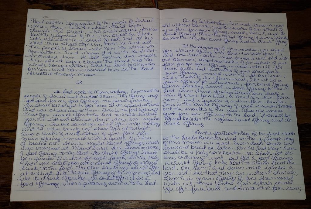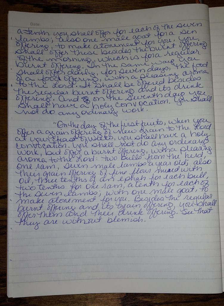 Consistency…. As I was doing my writing this morning, after I missed a few days, I couldn’t help but notice that He asked them to be consistent. They were to do these on specific times and every time these days went by. I could definitely take a lesson here. I haven’t been quite as consistent as I once was with my Bible time. I have allowed my crazy schedule to interfere with my Bible time. We will see what tomorrow brings. I know I can get back on track, just gotta move forward and not worry about yesterday. 🙂