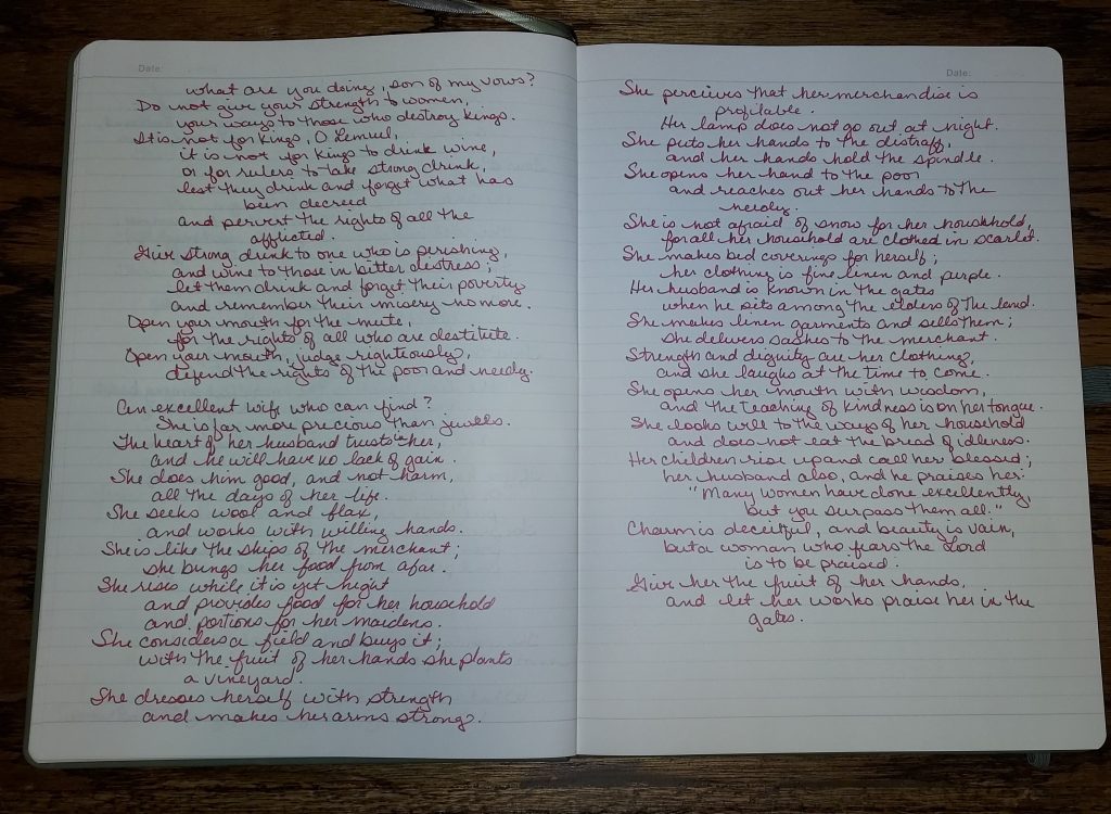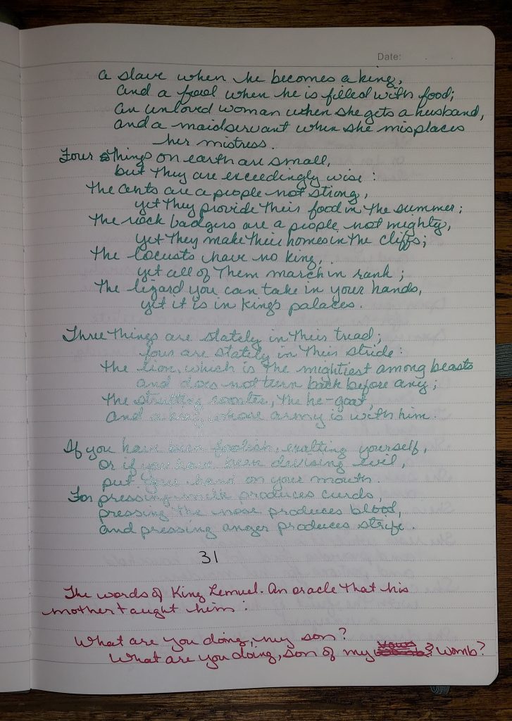 Good morning… The last chapter of Proverbs. I do admit that I enjoyed Proverbs a bit more than Psalms. Writing is different than reading. I am so thankful that I decided to take on the challenge to write the bible. It continues to teach me to slowdown as I go through the words of the bible.