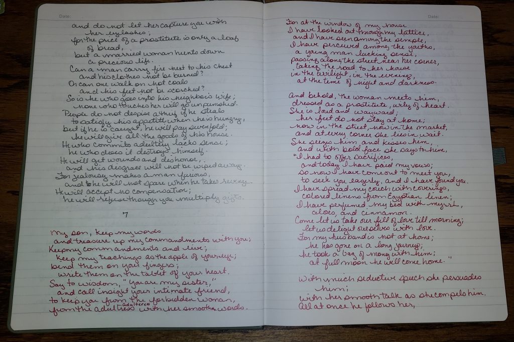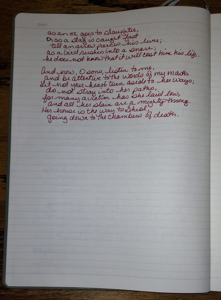 Good morning… As I was writing this chapter, I see Solomon warning his sons about the adulterous woman again. This must have been a strong subject for him. It makes me wonder if it had to do with his parents, his own experiences, or experiences he see others suffer through. I still believe it is one of the hardest temptations we have.