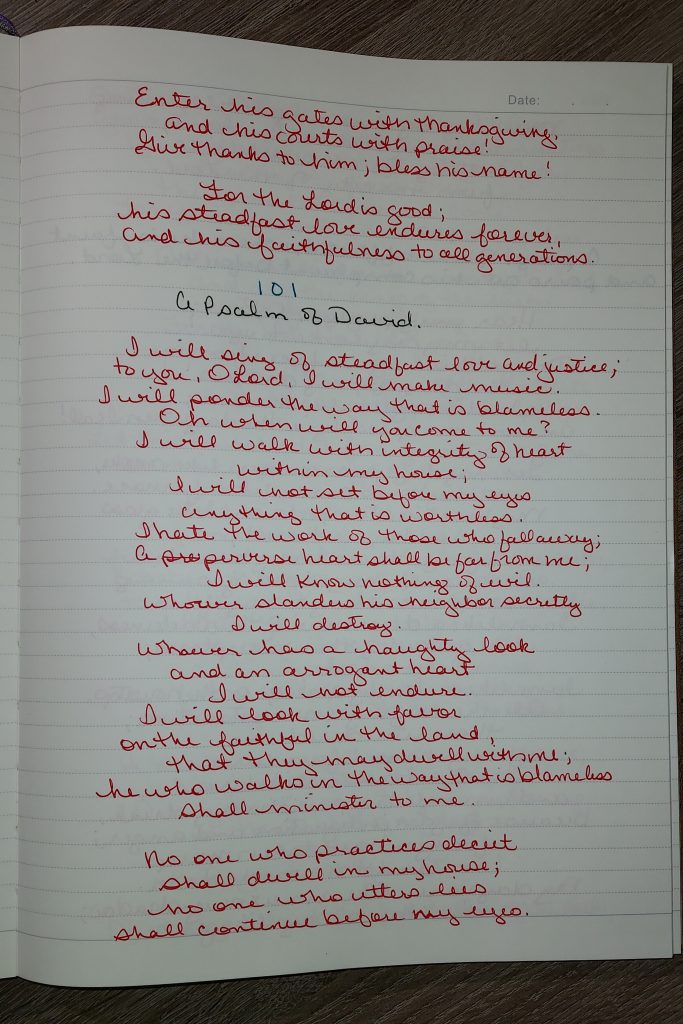 Good morning.. The Psalm 101 is titled “I will walk with integrity” in my book. I think it is titled well. I look at the words of David and see what he plans to do so that he can ‘walk with integrity of heart within my house’.