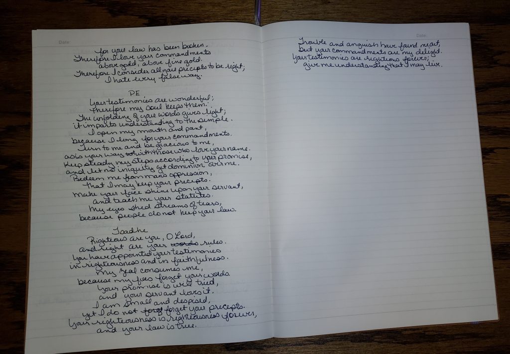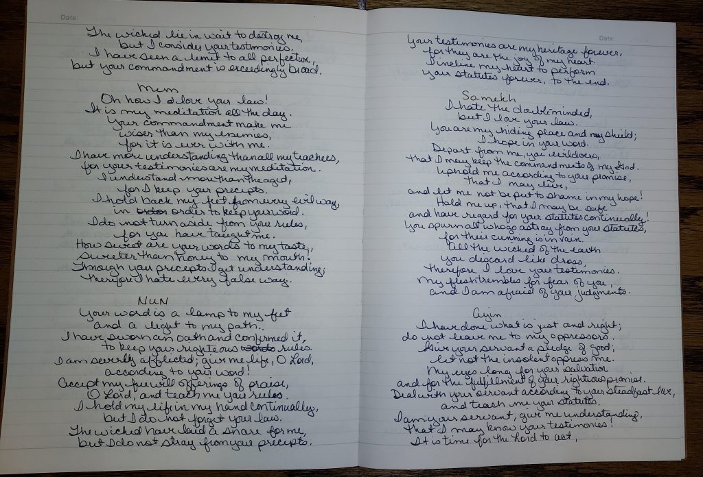 Good morning.. I decided today to refresh my mind on some of the details of 119. To begin it is the longest chapter in the Bible. It is also an acrostic chapter, containing 8 verses per Hebrew letter of their alphabet. That is right those divider words (Nun, Samekh, Ayin, etc) are the Hebrew alphabet. They have 22 letters. As we can see through the Psalm it expresses the importance of God’s word, statutes, rules, commandments, etc. Oh how important His rules are in our spiritual life and in life in general.