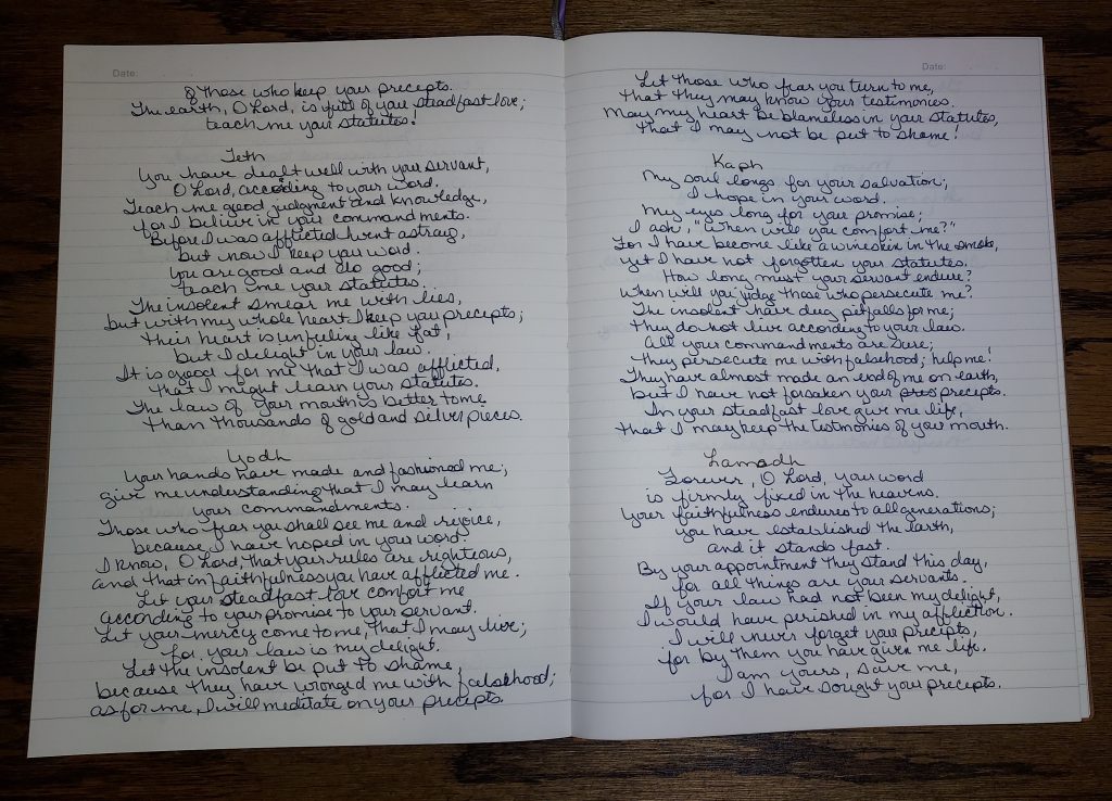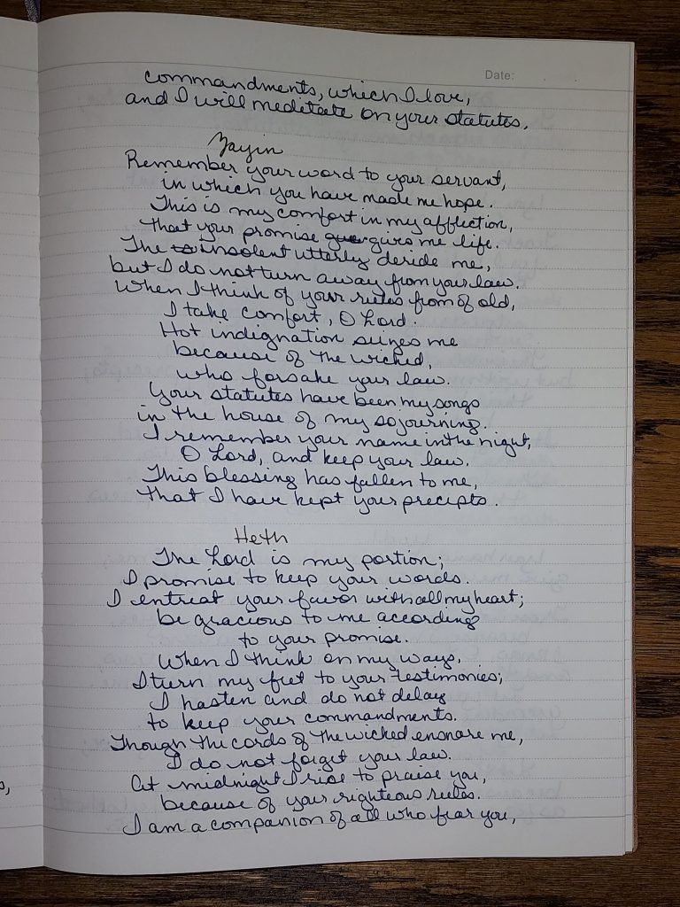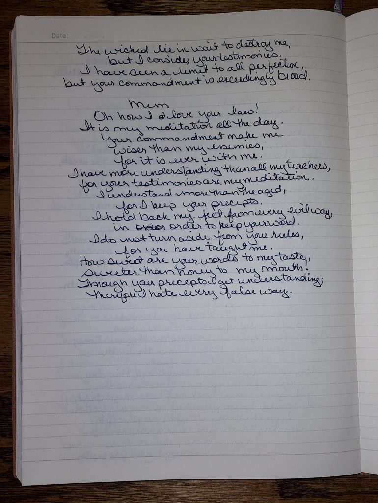 Good morning.. As I was writing a word kept popping up.. statutes.. Then it changed and another word popped up… precepts… These are in reference to ‘God’s statutes’ and ‘God’s precepts’. The writer of this Psalm puts a lot of focus on what God says and uses it in his life for guidance, for structure, and for his lively hood. He even says: