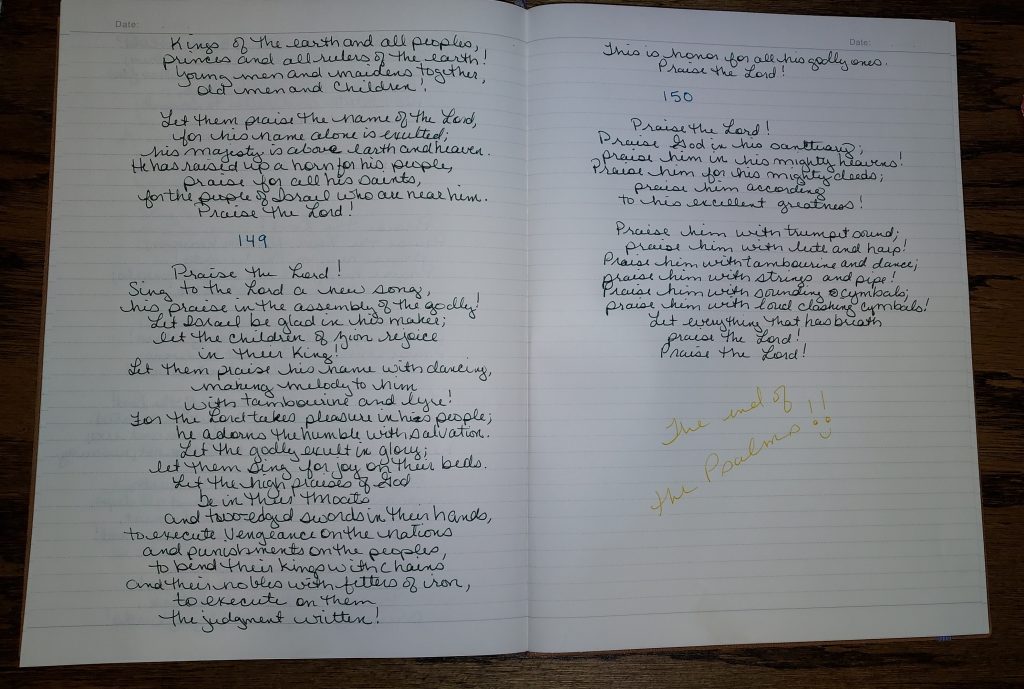 Good morning… The end of another book, the book of Psalms. This book took me 4 months, I started on Feb 8th and ended on June 8th. I am so glad I have taken on this task of writing the Bible.