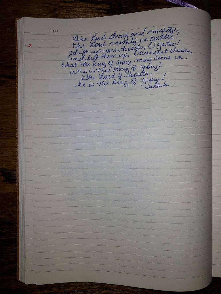 So many of us know Psalm 23, so I think I want to focus on 24. If you don’t know Psalm 23 then please take the time to read it, it is a beautiful Psalm.