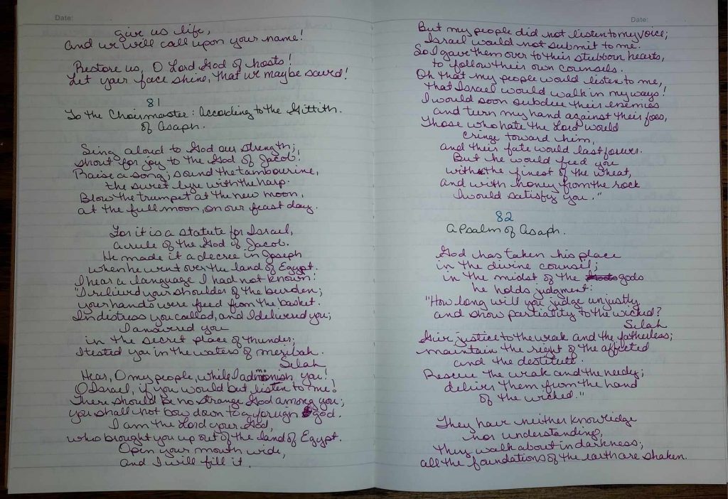 There is such a reliance on God in the Psalms. A constant yearning for God to be close to the writers. A constant line of communication, even when they thought God was silent. I know that I need to reach out to God in all my moments, whether in joy or in despair. The book of Psalms is a great example of this. The writers seem to make God part of all of their moments. Maybe I can do better.