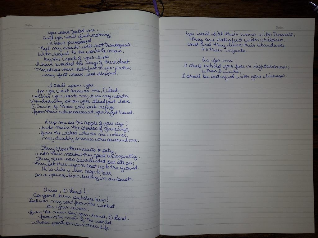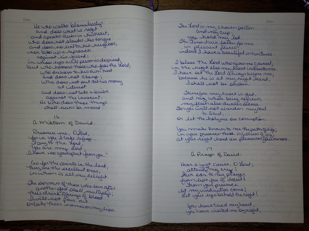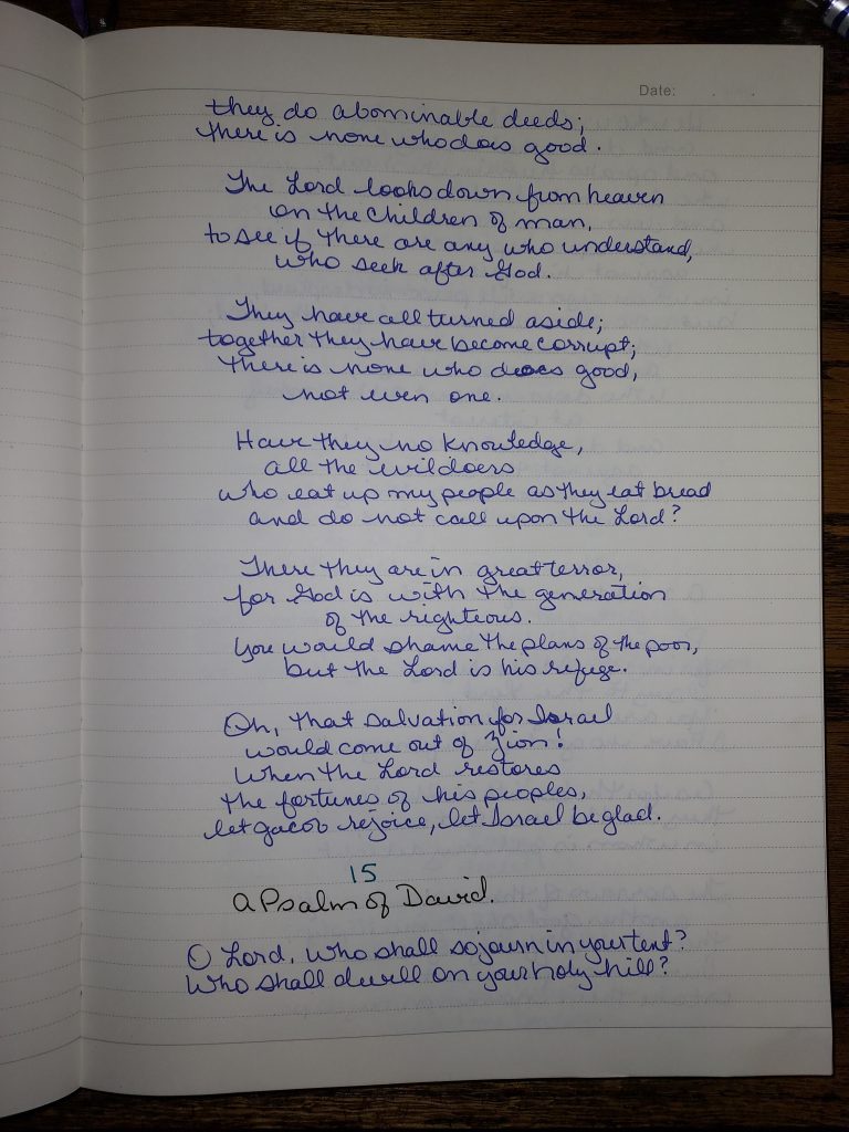 After writing this Psalm, it made me think, “no wonder David had such a good heart.” This is a great way to stay focused on what is important. I want to sojourn in His tent. I want to dwell on His holy hill. I am so blessed we have Christ to help in areas I fail.