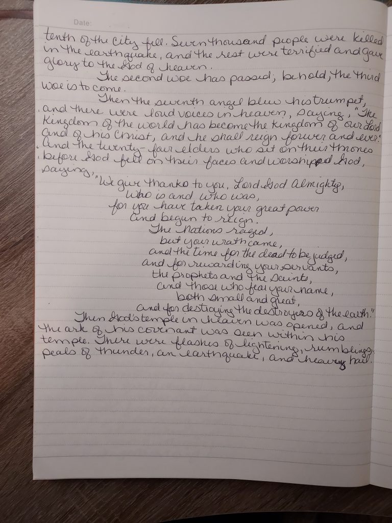 Good morning. I have reached the halfway point for the book of Revelation. I am so thankful that I have reached this far in my writing.