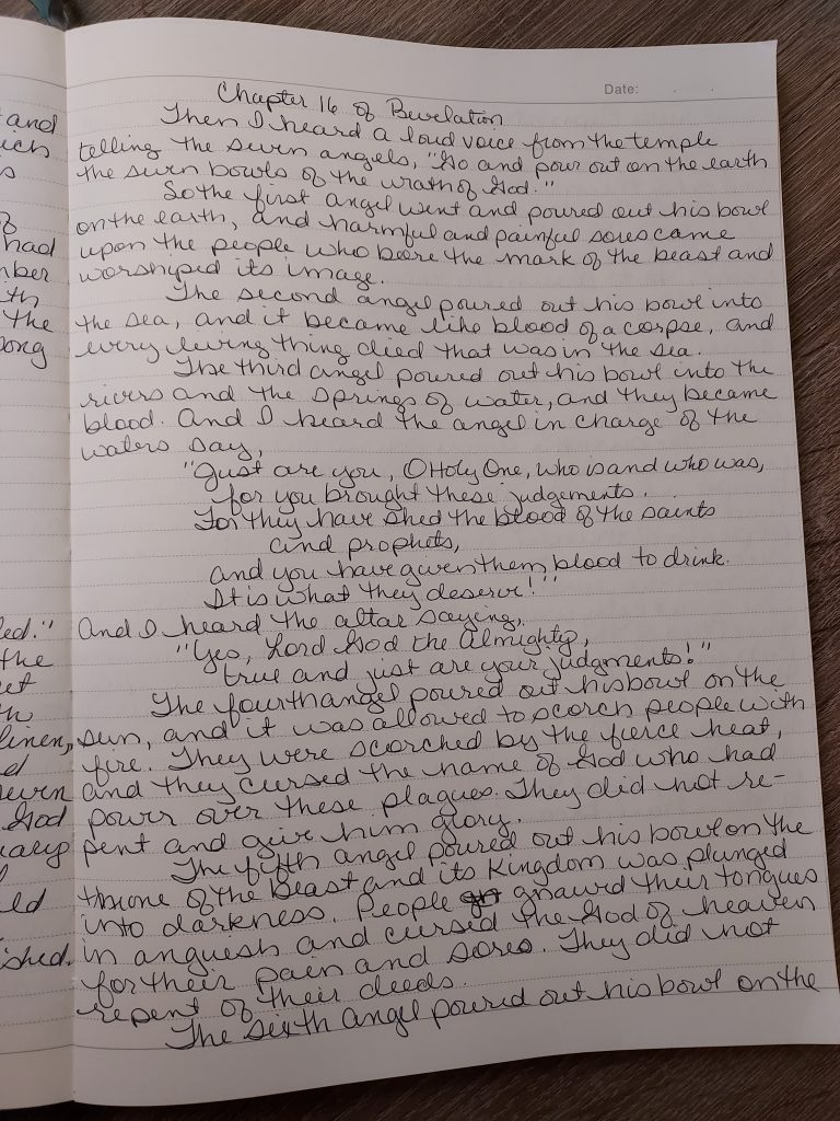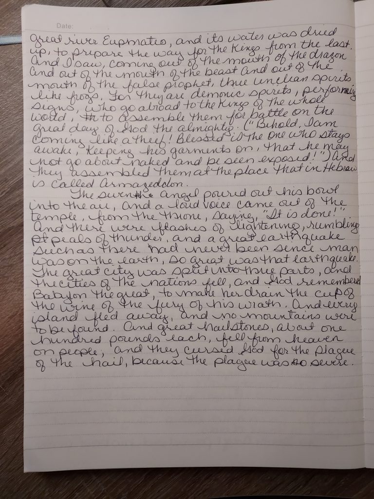 As I wrote these two verses, it made me think of those who were suffering from the pouring of the seven bowls of wrath. No matter how bad things got they did not repent and look to the Lord. I am thankful that as I suffer through the cares of the world that I can look to the Lord. I am thankful that as I suffer from my own sins that I can look to the Lord and receive forgiveness. I am thankful that as I suffer from anything that I can look to the Lord for comfort and love.