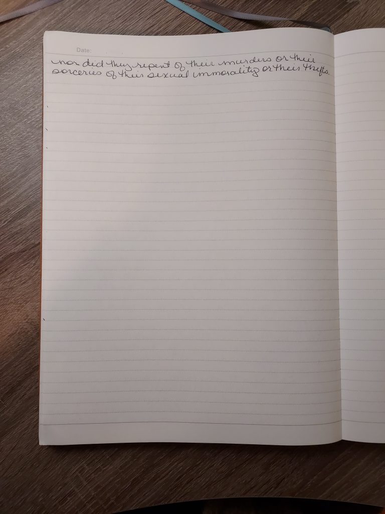 The rest of mankind, who were not killed by these plagues, did not repent of the works of their hands nor give up worshiping demons and idols of gold and silver and bronze and stone and wood, which cannot see or hear or walk, not did they repent of their murders or their sorceries or their sexual immorality or their thefts.