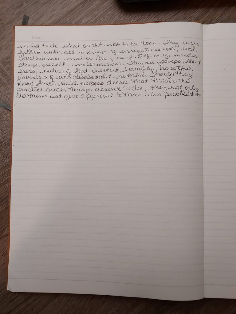 As I got to the verses 18 and following, I was saddened as he was writing about the unrighteousness of men. As I wrote, I seen all of the words that are used to describe them and some of these descriptive words hit close to home. The words either described me at times or described those who I have known. These are people who knew the truth but made a choice not to follow the Lord. Not only did they not follow the Lord but they went against Him and their ‘hearts were darkened‘.