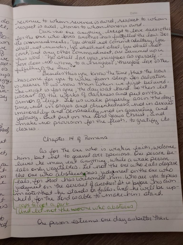 Good morning, a chapter on one subject: judging and offending a fellow Christian. There are times I may have a difference of opinion with someone, but is neither of us are right or wrong to God. I need to be mindful of others and have respect for them. In this chapter, it uses food and special days as an example. I need to be careful and not argue over little things that will cause us to separate. I have to admit I have failed at this many times. I need to keep in mind that my way isn’t the only way, and that my way isn’t always the right way. In my experience, I have found, that most of the things we disagree about have nothing to do with salvation, yet it hardens my heart and in turn affects my salvation or another’s. Our hearts can be tender at different times of our lives. Let us be loving and gentle to one another.