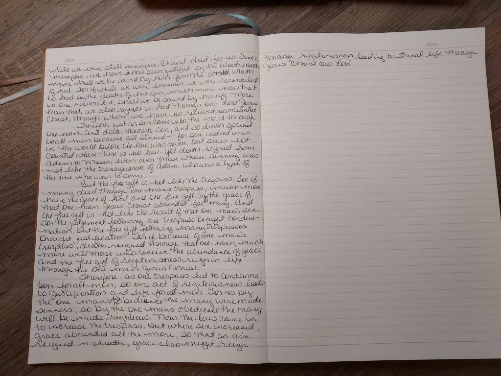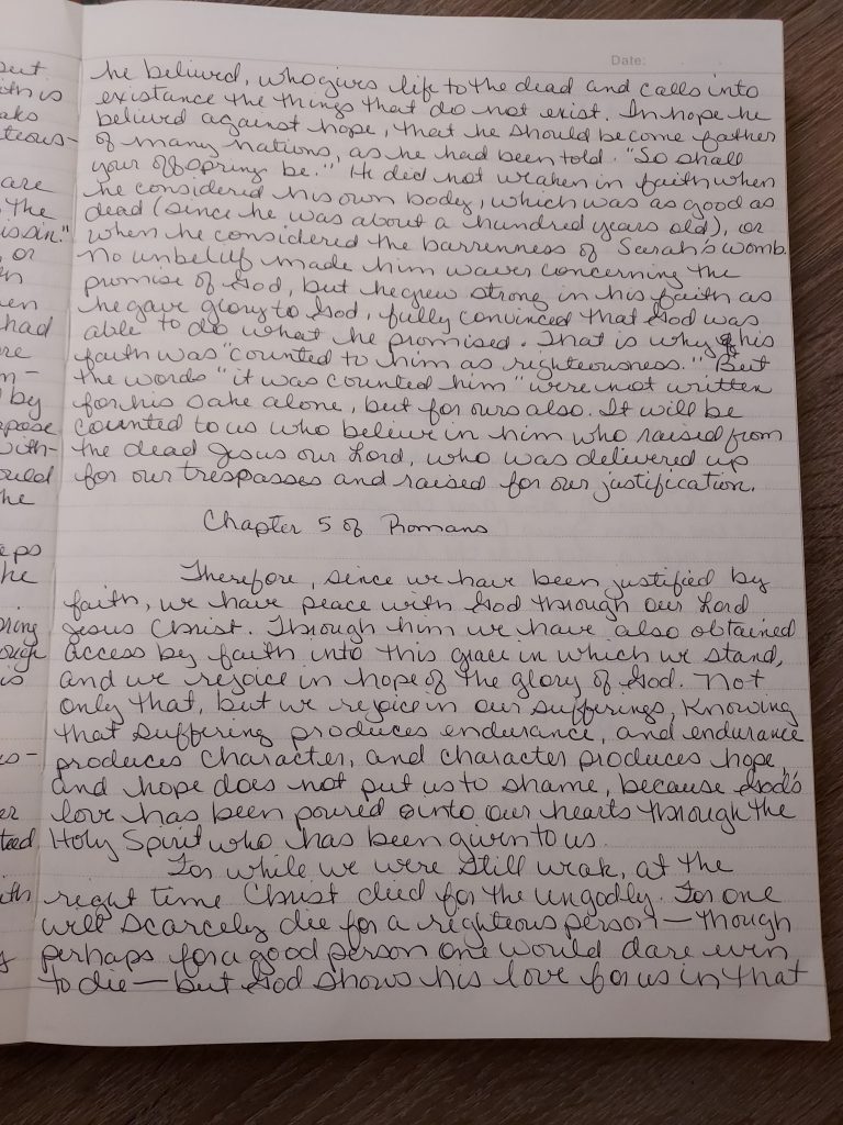 Good morning. Today I find so much hope in the chapter. As I was writing through chapter 5, I seen how just one man’s (Adam’s) action brought sin into the world and with sin came death. But I also seen that another Man’s (Jesus’) action brings about hope and eternal life.